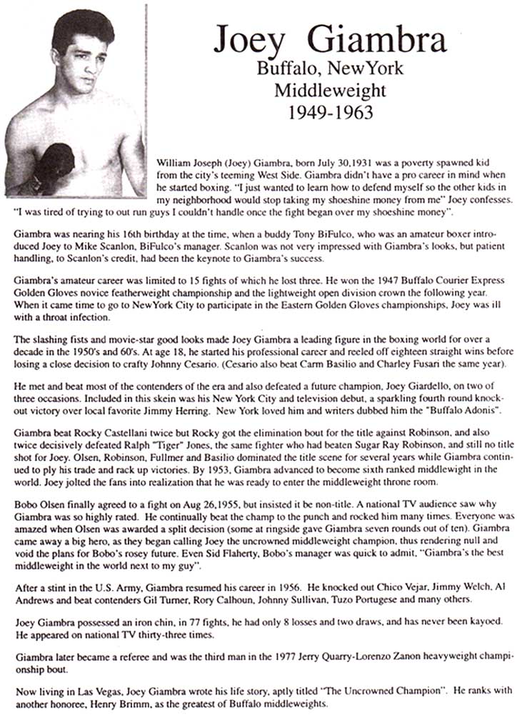 Boxing in Buffalo, NY - Table of Contents ............... Boxing Insider Buffalo Veterans Boxers Association 2004 Annual Dinner Banquet Program Joey Giambra 1931-1981