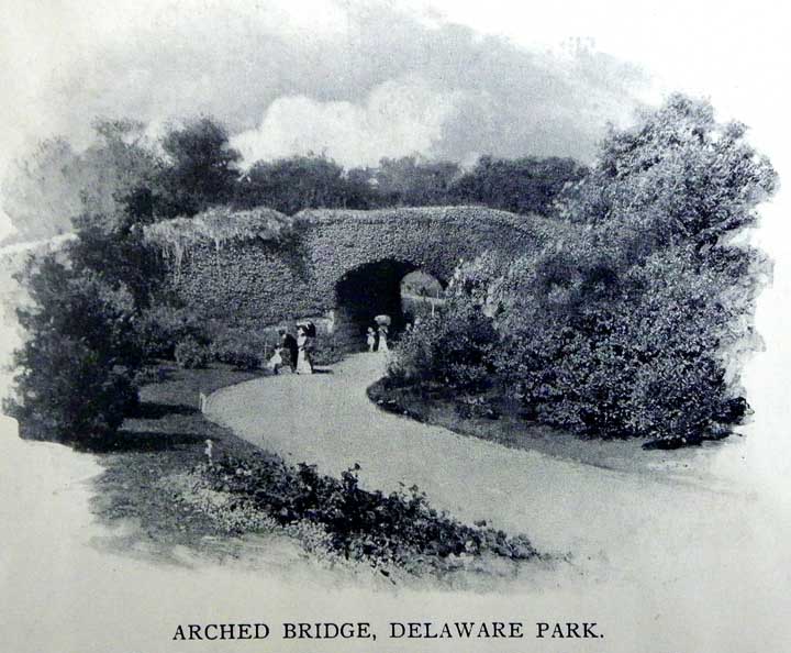 ![]() Onondaga limestone quarry west of of the Parkside Lodge. The quarry was later filled in and covered with a small bridge. |