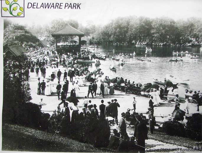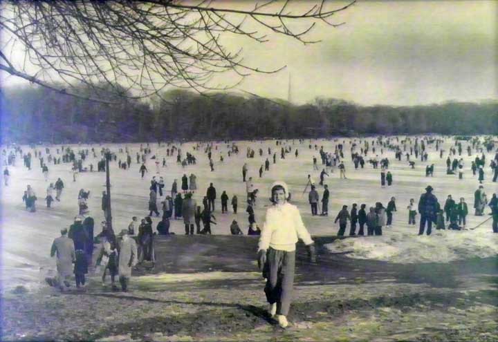 ![]() Skaters frolic on the ice-covered Delaware Lake. |