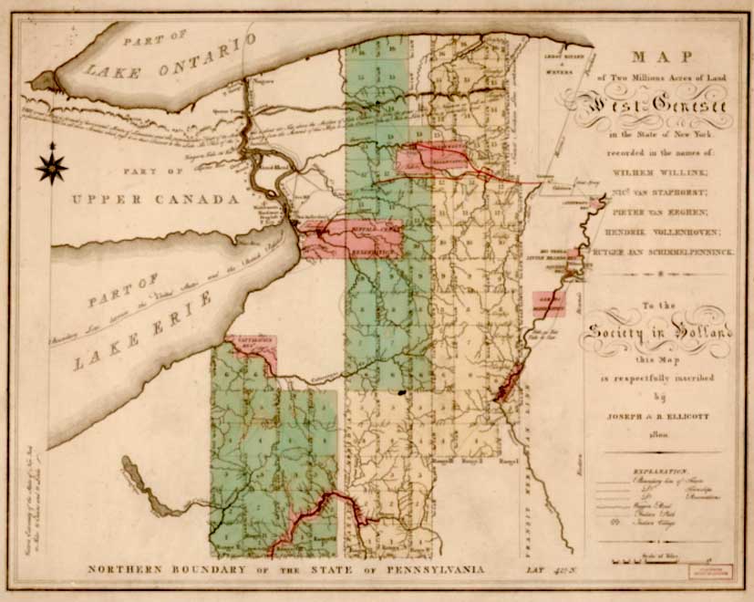 The first Europeans were under French explorer Robert Cavalier De La Salle. His expedition had set out to explore the Ohio and Mississippi Rivers via the St. Lawrence Seaway. While the expedition would not reach its goal, it did make it to the Niagara River, where a trading post was established in 1678. The French had allied themselves with the Algonquins and as a result had made enemies of the Five Nations, who had been successfully trading with the English, as they expanded their colonies up the Hudson River. These hostilities would result in a series of skirmishes between the French settlements and the Five Nations. The French were able to slowly gain favor with the Senecas thanks to Louis-Thomas Chabert de Joncaire, who had been captured. Joncaire would go on to learn the Seneca’s language and act as an ambassador to French colonial interests. With the French having established a foothold on the southern shores of Lakes Erie and Ontario, this would add to growing tensions with the English, who had claimed all territory south of the Great Lakes. Both would be pulled into the French and Indian War in 1754, which would end in 1763 with English victory and the expulsion of the French from their North American colonies. At this time, the Western portion of the state was owned by the Seneca Nation. "In 1787, Oliver Phelps had purchased the right of preemption from Massachusetts…in June 1788, he met the Senecas at Buffalo, and concluded a Treaty by which they conveyed to him the territory lying between the pre-emption line and the Genesee River, and a strip of land on the west bank of that River, twelve miles wide and about twenty miles in depth from mouth." 3 This was known as the Phelps’ and Gorham Purchase. At the same time, the Constitution of the United States was in the process of being ratified. With the Revolutionary war and establishment of the United States, people slowly began to emigrate west. By August 1797, the Holland Land Company, through its agent Joseph Ellicott, was in the process of acquiring the remaining lands. What enticed people were the “cheap and fertile lands of Western New York.”3 ![]() Library of Congress, Geography and Map