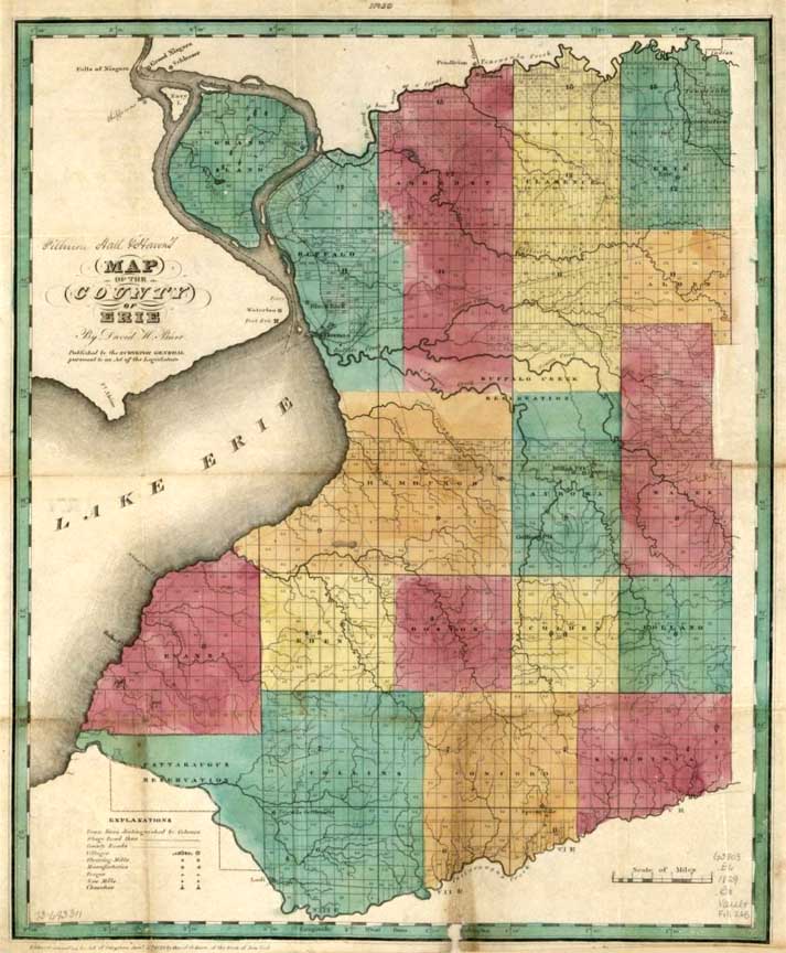 Erie County would continue to grow and become a large metropolitan area well into the 20th century. This is just a brief glimpse at our history, if you want to learn more, I highly recommend checking out some of the sources I used, listed below. 1. 2222Pendergast, James F. “The Kakouagoga or Kahkwas: An Iroquoian Nation Destroyed in the Niagara Region.” Proceedings of the American Philosophical Society 138, no. 1 (1994): 96-144. Accessed May 10, 2021. 2. Lionel Pincus and Princess Firyal Map Division, The New York Public Library. “City and Town Histories.” New York Public Library Digital Collections. Accessed May 26, 2021. 3. George W. Clinton: “Early History of Buffalo by Hon. George Clinton.” New York Heritage Digital Collections. Accessed May 1, 2021. Photo Credits in order of appearance, Top to Bottom. 1. Two people on rocks overlooking the waterfalls at Niagara Falls: Le Loup, Antoine, Artist. Vue du cataracte de Niagara, au pais des Iroquois / Antoine Le Loup fecit. New York Ontario Niagara Falls, 1770. [Between ? and 1840?] Photograph. 2. Original Purchase by the Holland Land Company: Ellicott, Joseph, Benjamin Ellicott, Wilhem Willink, C. Van Baarsel, and Holland Land Company. Map of two millions acres of land, West Genesee, in the State of New York: recorded in the names of Wilhem Willink, Nic’s van Staphorst, Pieter van Eeghen, Hendrik Vollenhoven, Rutger Jan Schinnelpenninck. [Amsterdam?: Van Baarsel, 1800] Map. 3. 1829 map of Erie County: Burr, David H, and Millard Fillmore. Map of the county of Erie. [N.P, 1829] Map. |