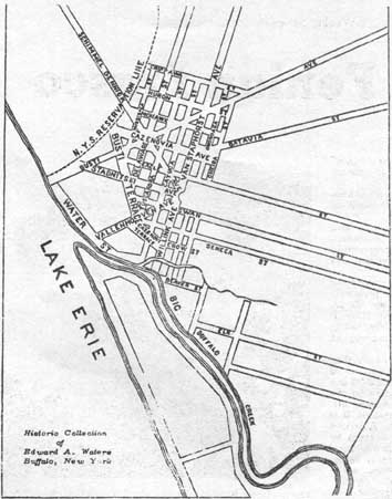In the center of Ellicott's frontage on Main Street had been a curve that made a jog of almost half a circle. Thus from this band radiated Niagara, Church and Erie Streets. Apparently Ellicott had planned to build a mansion on Lot 104 with the house to be placed on the curve.