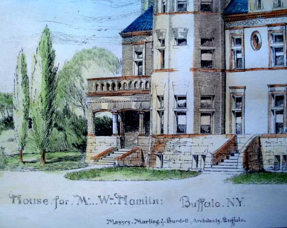 - "William's wife was Kate Gates, daughter of George Gates, the sleeping car magnate of #546 Delaware. William died in 1931 at eighty-one. His wife died in 1932. The house, a glut on the market in the Depression, stood empty until it was demolished in 1937 along with the barn where some of the famed Hamlin horses had been stabled. At that time three daughters of William and Kate Hamlin, Mrs. George A. Mitchell, Mrs. Susan Hamlin Follwell, and Mrs. Wilmot Griffis, resided at the nearby luxury apartments at #800 West Ferry." [Kate Gates Hamlin, at the time of her death, lived at 800 West Ferry.]