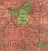 The story of this most interesting neighborhood is well worth the telling. Named after Victorian horse racing aficionado Cicero Hamlin, the area was one of the nation's premier trotting tracks from the time Hamlin opened it in 1858 to the end of the century Race days at Hamlin's Driving Park [see map near top of page] were festive events. At one of them, billed and widely promoted by Hamlin as the "Kentucky Derby of the North," 40,000 people descended on the park. Following the extravaganza, throngs of people walked across Frederick Law Olmsted's grand Humboldt Parkway to The Parade for three cent pints of beer and hours of music played by The Turnverein band. Olmsted's final plan for the City's park system paid homage to Hamlin's Park. For it was here, at the north-eastern end of the Driving Park, near Agassiz Circle, that Humboldt Parkway arched elegantly on its gentle flow southward and eastward from Forest Lawn to The Parade.