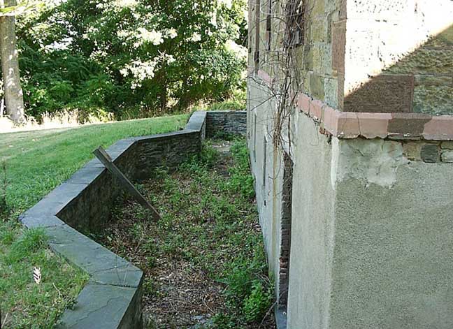 Left side (west). The principal floor is stilted up some distance from the surface to allow natural light in the basement, including the bsement kitchen
