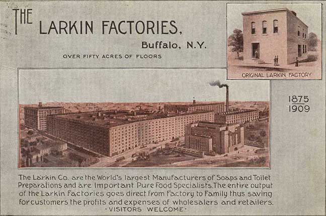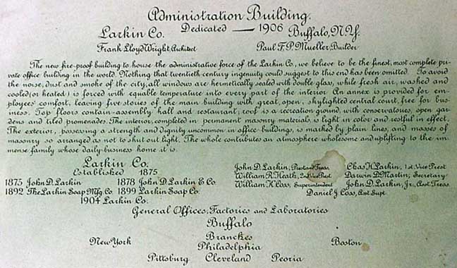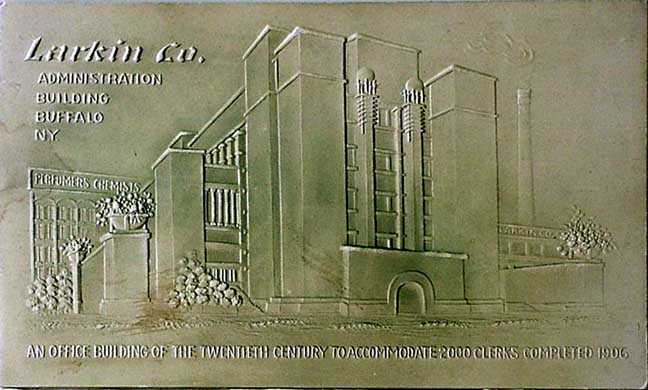 ![]() 1906 Larkin Administration Building ![]() Larkin Co. delivery trucks lined up in front of the Larkin Administration Building ![]() Larkin Administration Building official opening ceremony souvenir. ![]() Larkin Administration Building drawing. Pub. in Germany. American architects grudgingly came to admire Wright's design after it was widely heralded in Europe. ![]() Back cover of the Larkin Administration Building official opening ceremony souvenir.