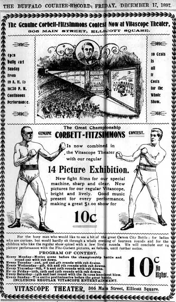 The Mark brothers, Mitchel (obituary) and Moe, surely took note of the excitement over early motion pictures, and soon after they moved their Edisonia Phonograph Parlors to a room in the basement of the new Ellicott Square Building, they added what they called Edison's Vitascope Theater, which they opened to the general public on Monday, 19 October 1896, in collaboration with Rudolph Wagner, who had moved to Buffalo after spending several years working at the Edison laboratories.
