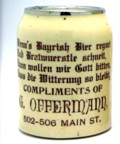 ![]() ![]() Left: Mini stein/match striker. for Gottfried Offermann's saloon in Buffalo, NY writing says:"Wenn's bayrisch Bier regnet und Bratwürste schneit dann wollen wir Gott bitten dass die Witterung so bleibt." Translation:"If it's raining Bavarian beer and bratwurst snowing then let us ask God that the weather remains" Right: An ad that appeared in a program for the Shea's Garden Theatre during the 1903/1904 season. |
