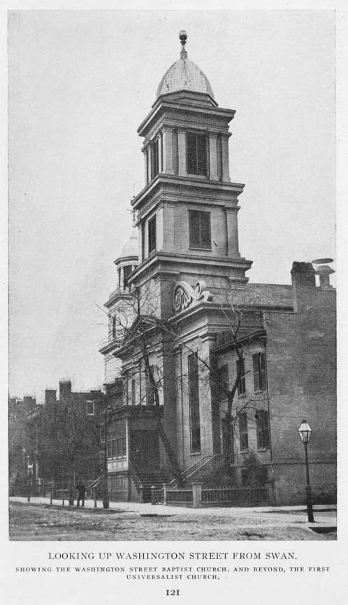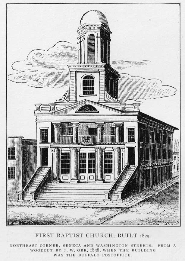 Baptist Church, built 1829 First Baptist Church, first home of the medical school. Originally built as a Baptist church, the building served between 1836 and 1846 as a post office. In 1847 the building became the first home of the newly organized (1846) University of buffalo Medical School. The university, at first, and for many years, was only a medical school Illustrations source: "The Picture Book of Earlier Buffalo," Frank H. Severance, ed. Buffalo Historical Society Publications, Vol. 16, 1912  |